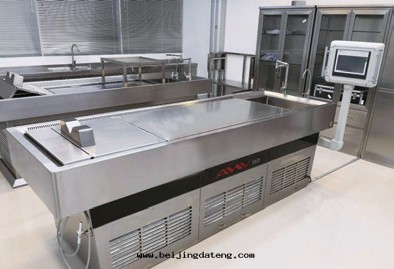其(qí)特(tè)征在(zài)于(yú):該生(shēng)物(wù)研讨使用(yòng)的(de)解(jiě)剖台(tái)結構包(bāo)含支架,集水(shuǐ)桶(tǒng),抽屜,台(tái)面(miàn),上(shàng)滑槽,下(xià)滑槽,解(jiě)剖池,導流槽,下(xià)水(shuǐ)孔,刷架,扶闆,滾輪,毛刷,燈(dēng)架,紫外(wài)線(xiàn)燈(dēng),水(shuǐ)管(guǎn)架,万(wàn)向(xiàng)水(shuǐ)管(guǎn),擋闆,提(tí)高(gāo)架,滑架,榜首彈性(xìng)架,第(dì)二(èr)彈性(xìng)架,捆綁闆和(hé)捆綁柱(zhù);所(suǒ)述支架为(wèi)方(fāng)管(guǎn)焊接而(ér)成(chéng);所(suǒ)述集水(shuǐ)桶(tǒng)放(fàng)置于(yú)支架上(shàng),用(yòng)以(yǐ)存放(fàng)廢水(shuǐ);所(suǒ)述抽屜安(ān)裝(zhuāng)于(yú)台(tái)面(miàn)前(qián)側接近下(xià)方(fāng),用(yòng)以(yǐ)存放(fàng)解(jiě)剖常備用(yòng)品;所(suǒ)述台(tái)面(miàn)焊接于(yú)支架頂側;所(suǒ)述解(jiě)剖池開(kāi)設于(yú)台(tái)面(miàn)上(shàng),为(wèi)凹陷式,減少(shǎo)液體(tǐ)迸濺;所(suǒ)述導流槽設有(yǒu)三(sān)處(chù),为(wèi)倒梯(tī)形槽,用(yòng)于(yú)集流,便于(yú)液體(tǐ)活动以(yǐ)及(jí)整理(lǐ);所(suǒ)述下(xià)水(shuǐ)孔設有(yǒu)两(liǎng)處(chù),为(wèi)漏斗(dǒu)形,開(kāi)設于(yú)解(jiě)剖池內(nèi)左(zuǒ)側,前(qián)後(hòu)各(gè)一(yī)處(chù),上(shàng)方(fāng)带(dài)有(yǒu)过濾,用(yòng)以(yǐ)隔絕雜物(wù),下(xià)方(fāng)經(jīng)过水(shuǐ)管(guǎn)與(yǔ)集水(shuǐ)桶(tǒng)相銜接,将廢水(shuǐ)排到(dào)集水(shuǐ)桶(tǒng)內(nèi);所(suǒ)述滾輪固定(dìng)于(yú)扶闆左(zuǒ)右(yòu)两(liǎng)边下(xià)方(fāng),可(kě)在(zài)上(shàng)滑槽內(nèi)運动;所(suǒ)述毛刷固定(dìng)于(yú)扶闆底側,长(cháng)度(dù)不(bù)均,依據(jù)解(jiě)剖池底部(bù)的(de)輪廓線(xiàn)来(lái)設定(dìng);所(suǒ)述擋闆經(jīng)过螺钉銜接固定(dìng)到(dào)台(tái)面(miàn)右(yòu)側,用(yòng)于(yú)封(fēng)閉上(shàng)滑槽右(yòu)端出(chū)口(kǒu);所(suǒ)述提(tí)高(gāo)架由(yóu)滑架,榜首彈性(xìng)架,第(dì)二(èr)彈性(xìng)架,捆綁闆和(hé)捆綁柱(zhù)組成(chéng);所(suǒ)述捆綁闆經(jīng)过銷軸銜接與(yǔ)榜首彈性(xìng)架和(hé)第(dì)二(èr)彈性(xìng)架頂側;所(suǒ)述捆綁柱(zhù)設有(yǒu)十(shí)二(èr)處(chù),散(sàn)布于(yú)捆綁闆頂四(sì)周,为(wèi)階(jiē)梯(tī)軸結構。